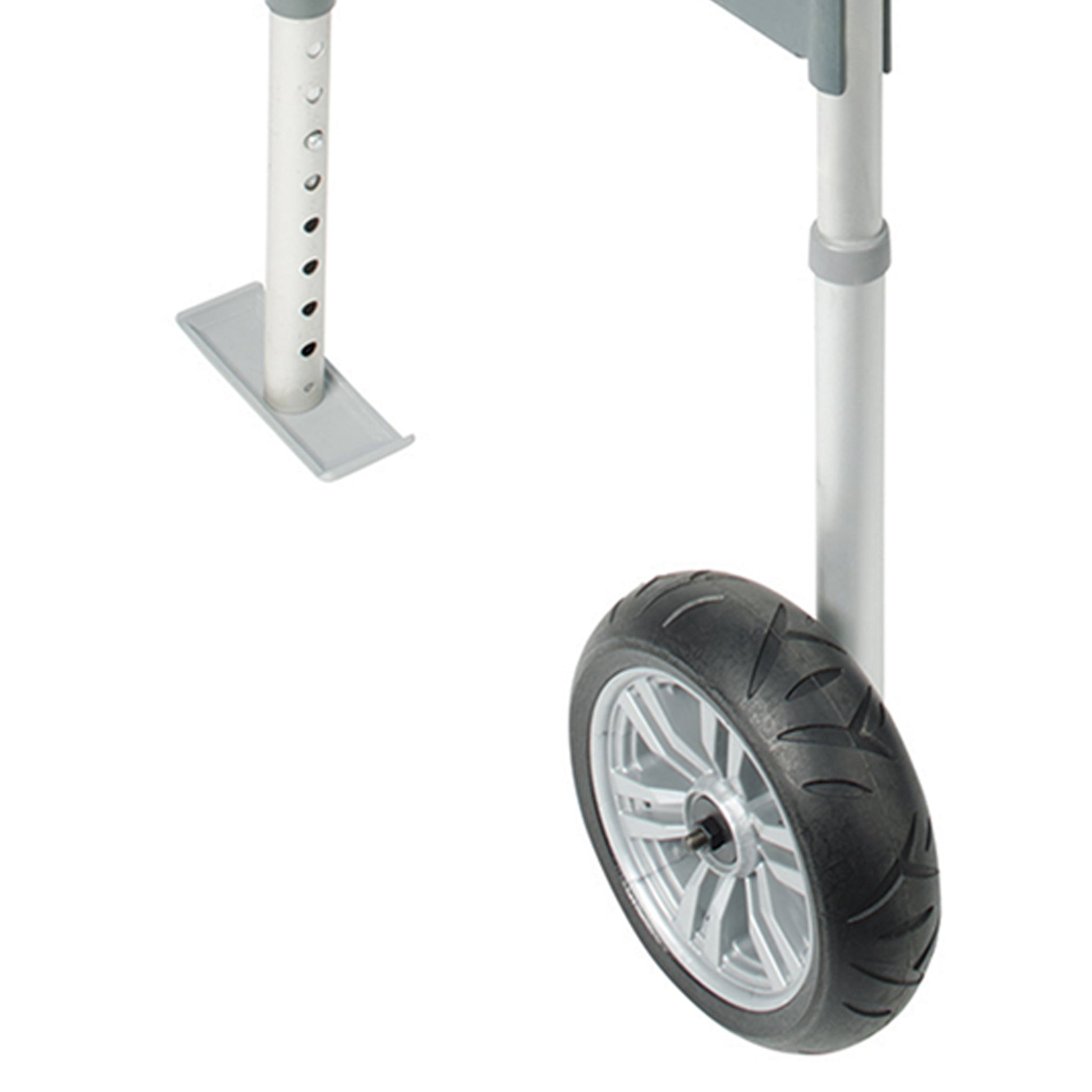 - 2" thick treaded wheels with 8 level adjustable legs slide easily onto your existing walker