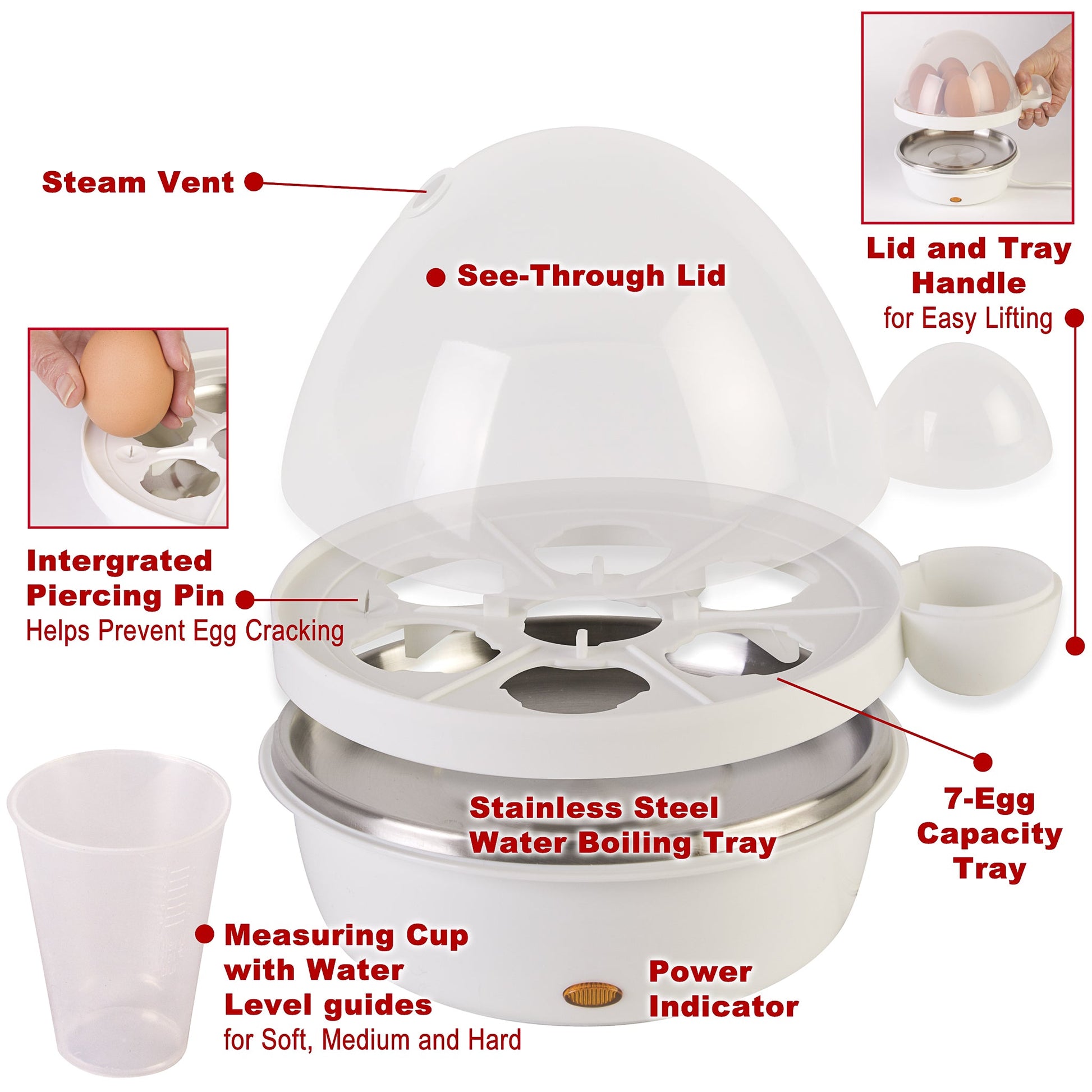 guides for SOFT, MEDIUM or HARD-boiled - Removable egg tray for easy handling