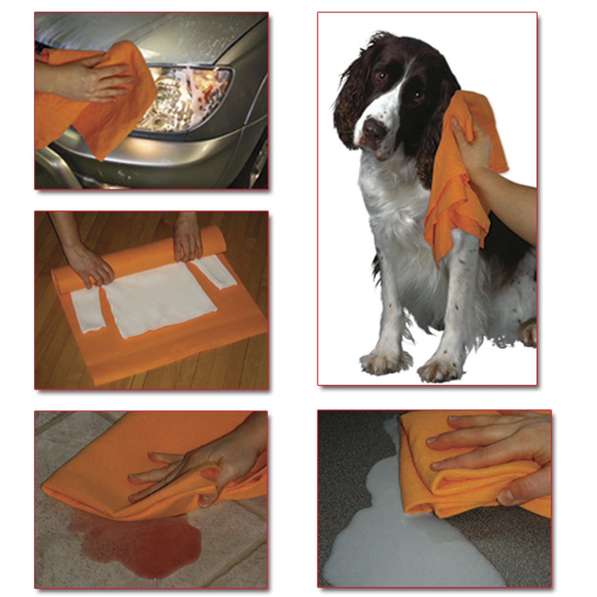 Over 27x more absorbent than paper towels and 2.4x larger than other large size towels. Machine-washable, non-drip, super absorbent towel. Use it on furniture, cars, to dry sweaters, pick up spills, care for your pet and much much more. Millions sold on TV!