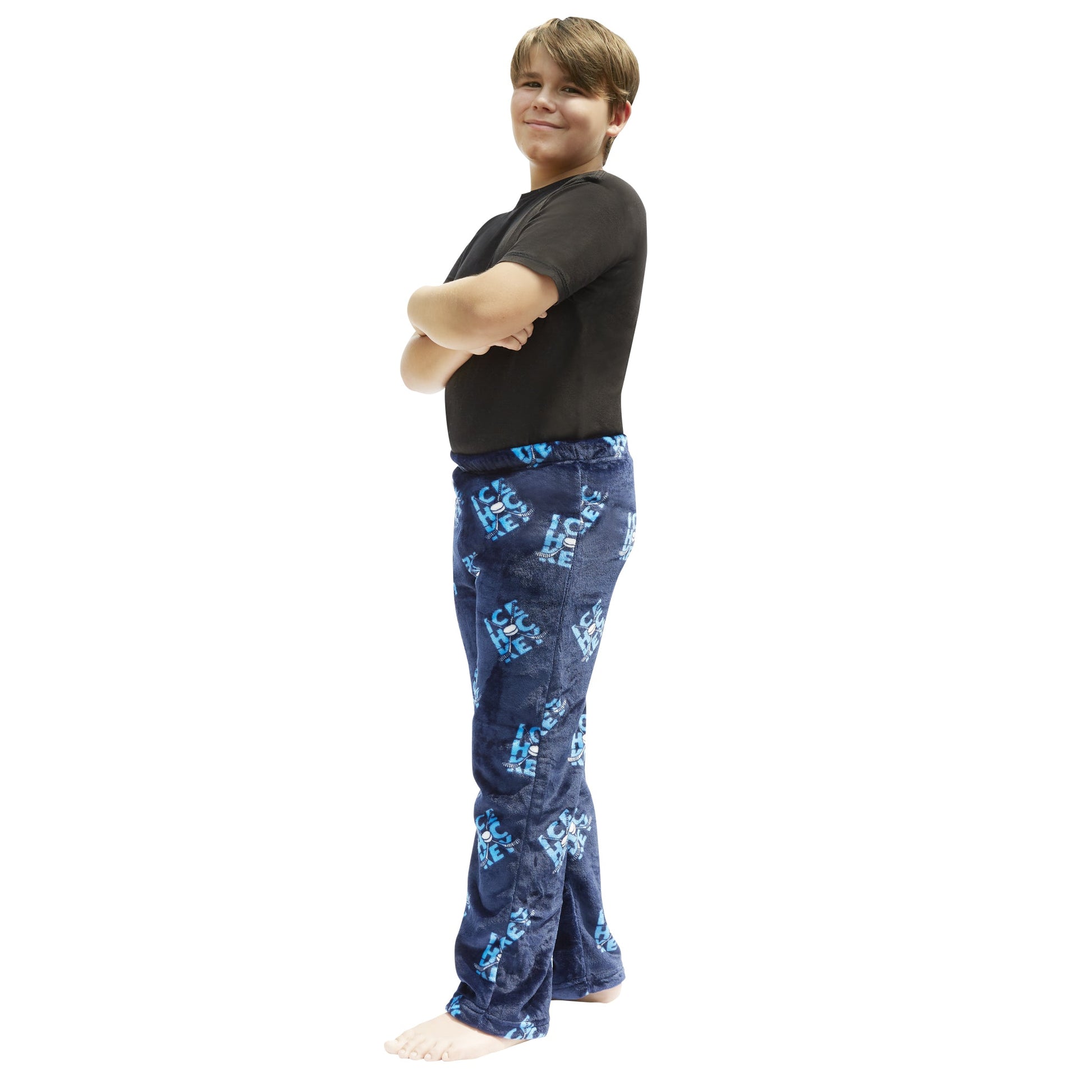 KIDS PAJAMA PANTS - Cozy up in style with our premium soft fleece blue hockey print pants with elastic band at the waist.