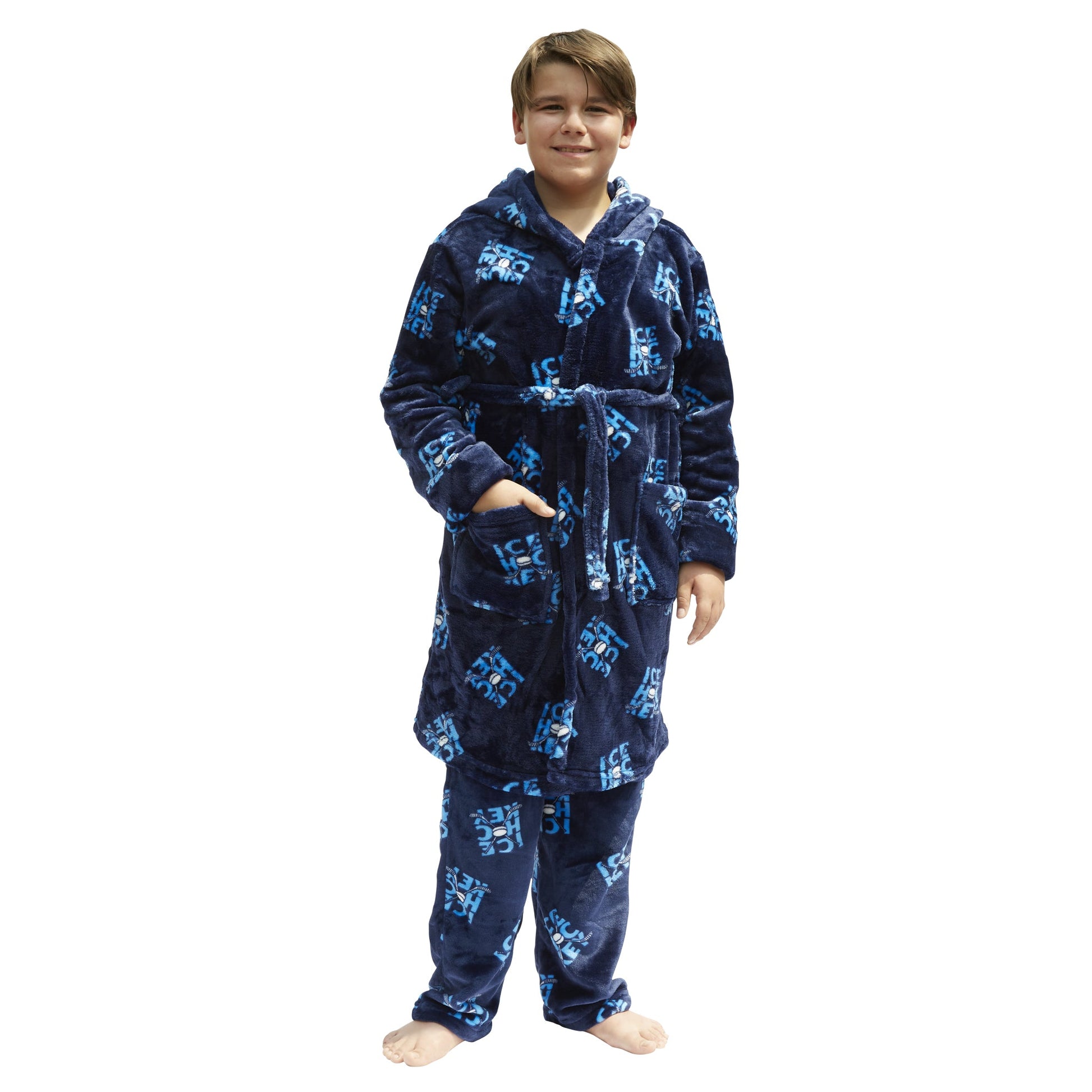 KIDS HOODED BATHROBE - Cozy up in style with our premium soft fleece blue hockey print knee length hooded housecoat.